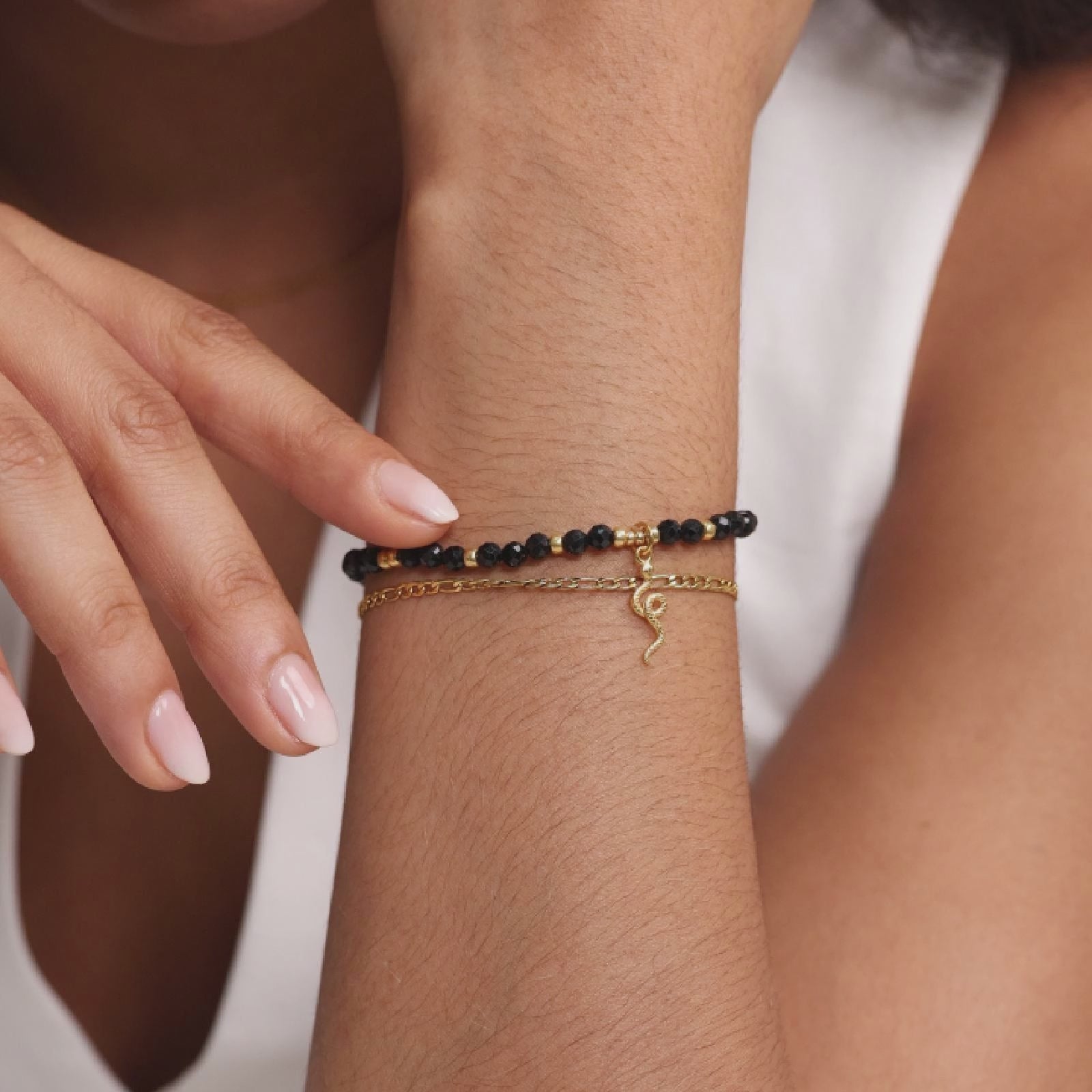 Dieses kraftvolle Armband besteht aus facettierten Perlen aus schwarzem Turmalin, ergänzt durch einen fein gearbeiteten Schlangenanhänger aus 925er Sterling Silber (vergoldet) – ein Symbol für Schutz, Transformation und innere Stärke.