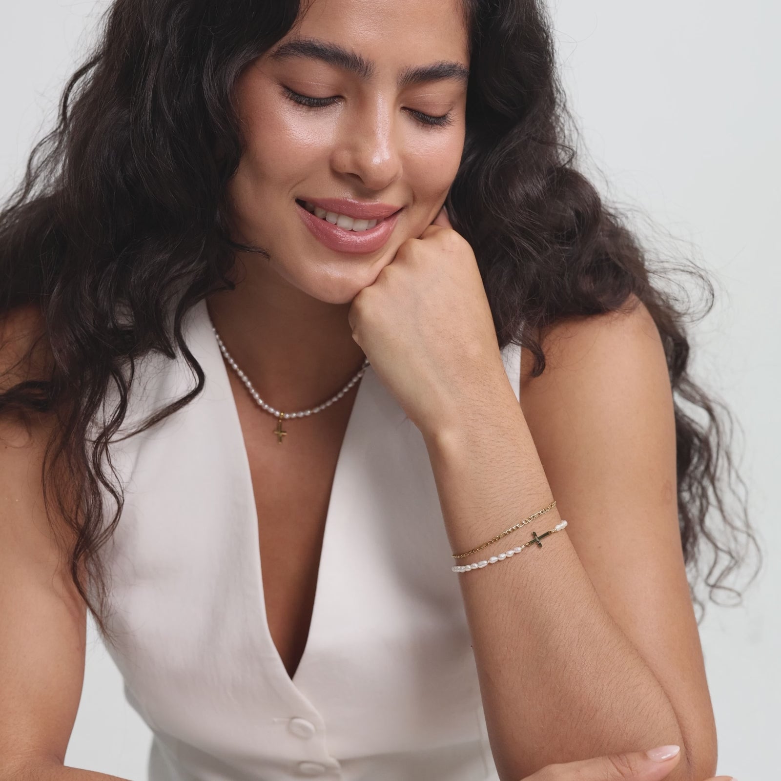 Ein zartes und bedeutungsvolles Schmuckstück – dieses Armband vereint feine Süßwasserperlen in zarter Naturform mit einem eleganten Kreuz aus Edelstahl.